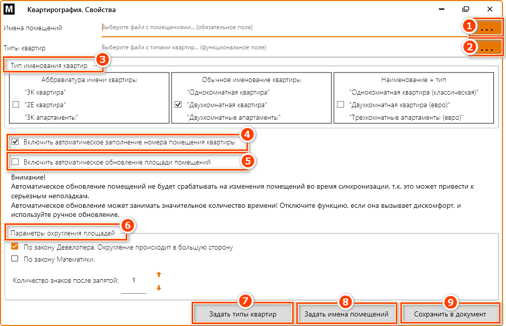 Укажите тип именования квартир [3] (см. Рисунок 10). Уточните у ГАПа какое наименование квартир используется в проекте.