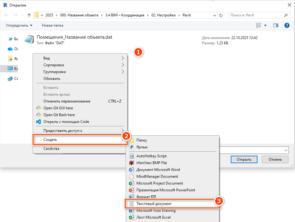 Далее перейдите по пути расположения файла. Щелкните в пустом месте правой кнопкой мыши («ПКМ») [1] и создайте [2] текстовый документ [3] и задайте имя по формату: «ТипыКвартир_Имя проекта», например, «ТипыКвартир _АпартСлава».