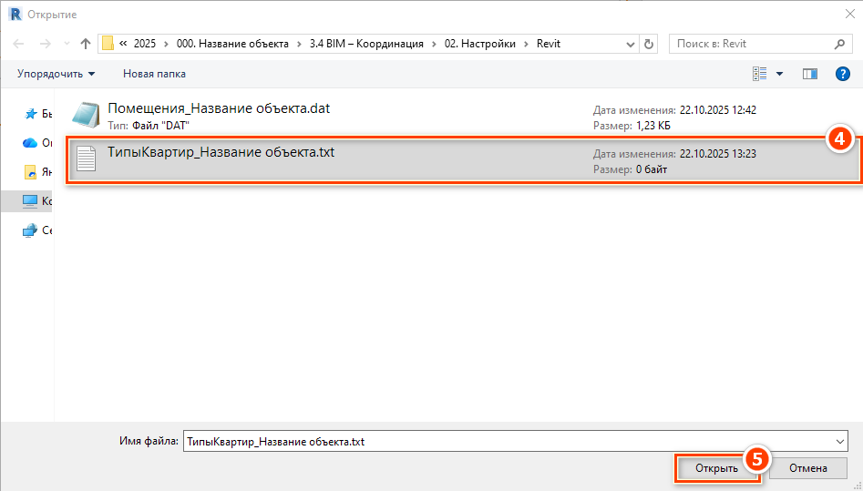 В открывшемся окне перейдите по пути расположения файла и укажите наименование файла в формате «Помещения_Имя проекта.dat», например, «Помещения_АпартСлава.dat».