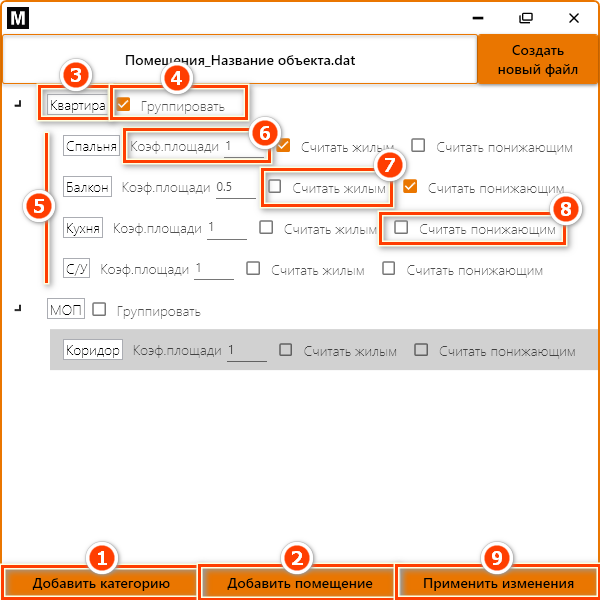 [1] – Добавьте категорию помещений, если это необходимо. Под категорией подразумевается назначение помещения, например, «Квартира», «МОП», «Коммерция» и т.д.;