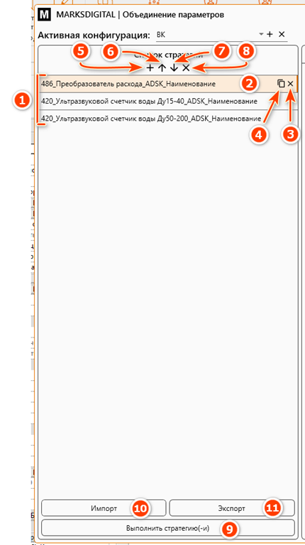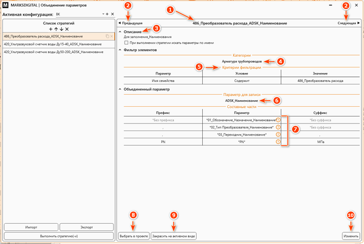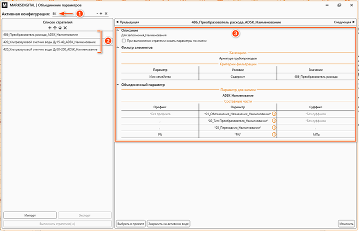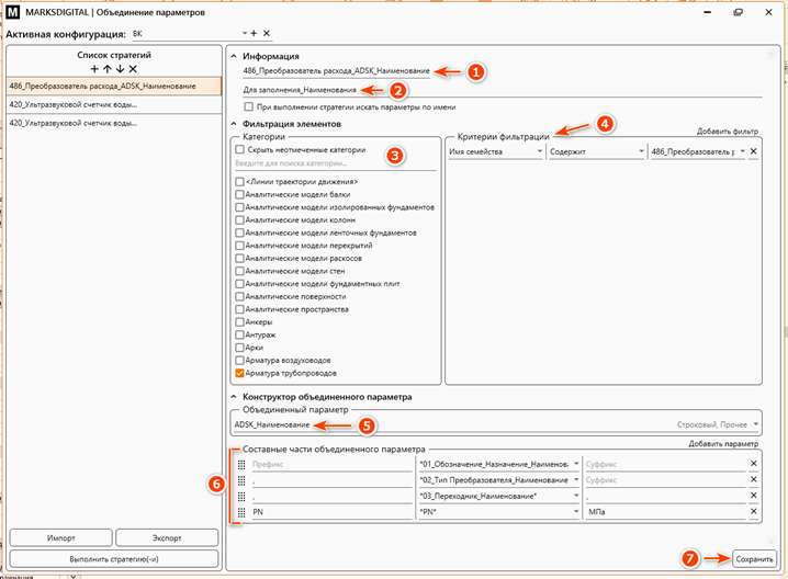В правой части окна отображается описание выбранной стратегии, фильтры для выбора элементов, составные части объединённого параметра и параметр для записи этих составных частей.