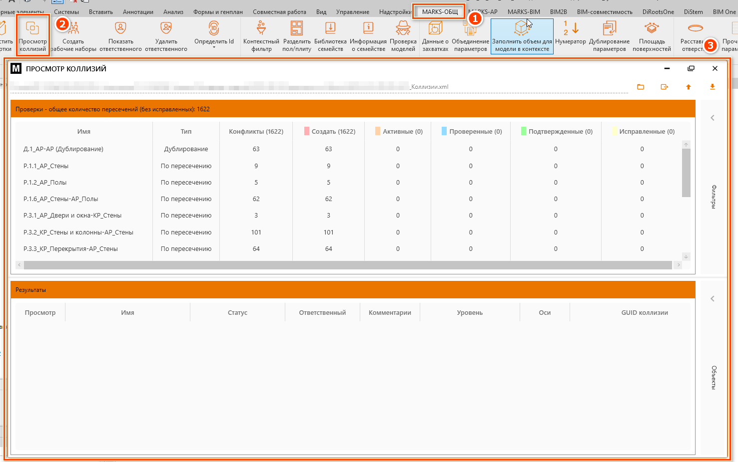 Переходим в Revit. На вкладке «MARKS-ОБЩЕЕ» [1] в совместной работе находится плагин «Просмотр коллизий» [2]. Окно плагина не зависимо от модели [3]. Позволяет разместить его на соседнем экране или растянуть до нужного размера (см. Рисунок 3).