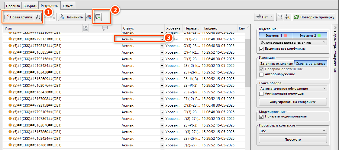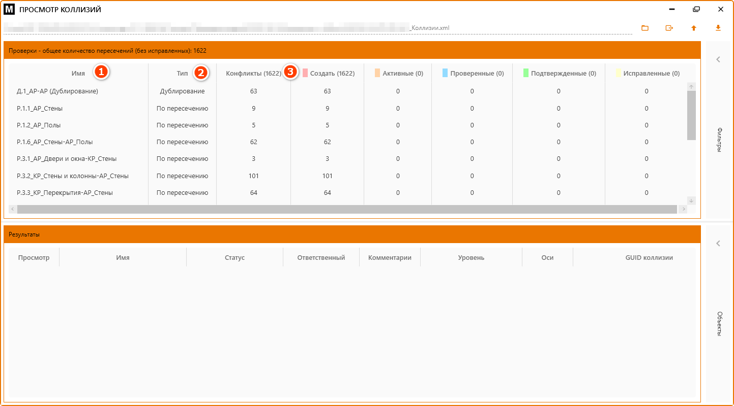 После загрузки отчета вы увидите привычный интерфейс как в Navisworks: список проверок на пересечения и количество пересечений, разбитое по статусам. Можно отсортировать проверки по имени [1], по типу [2], количество пересечений [3] (см. Рисунок 5).
