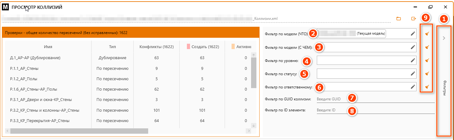 - «Фильтр по GUID коллизии» [7]. Позволяет произвести фильтрацию по уникальному GUID у конкретной коллизии из отчета.