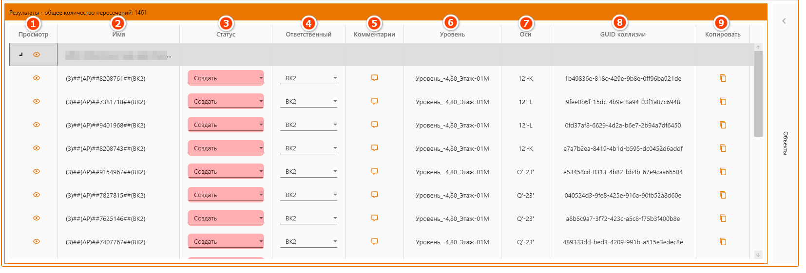 У каждого результата пересечения есть возможность создать 3D вид с коллизией [1]. Информация о имени [2], статусе [3], ответственном [4], наличии комментариев [5], уровне на котором расположено пересечение [6], оси [7], GUID коллизии [8]. Можно копировать всю информацию о конфликте [9] (см. Рисунок 8).