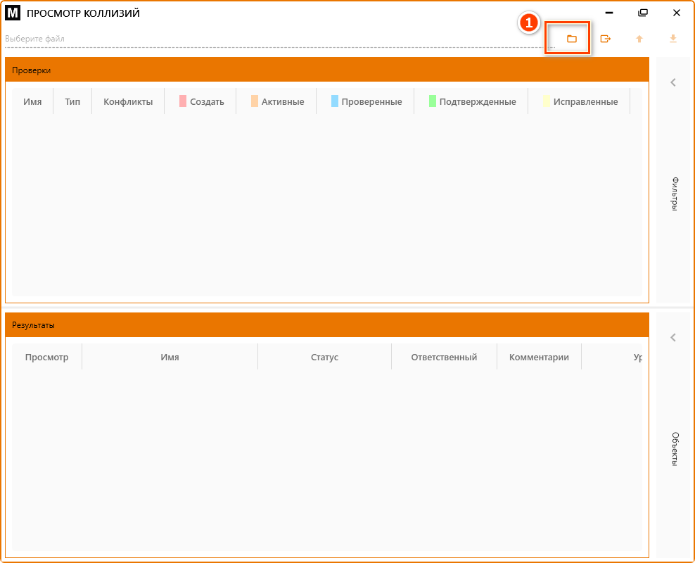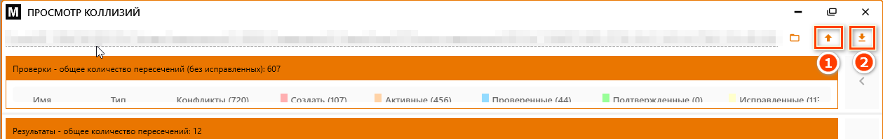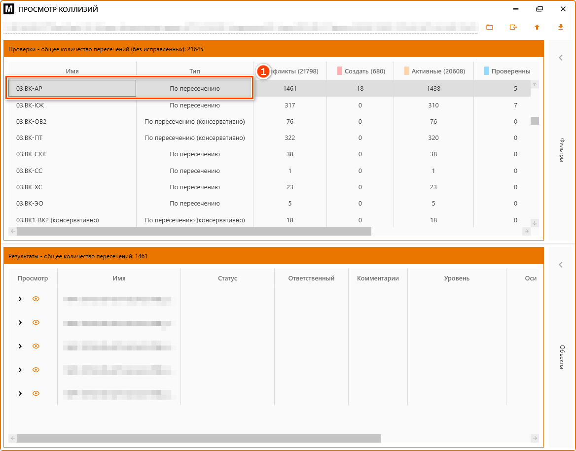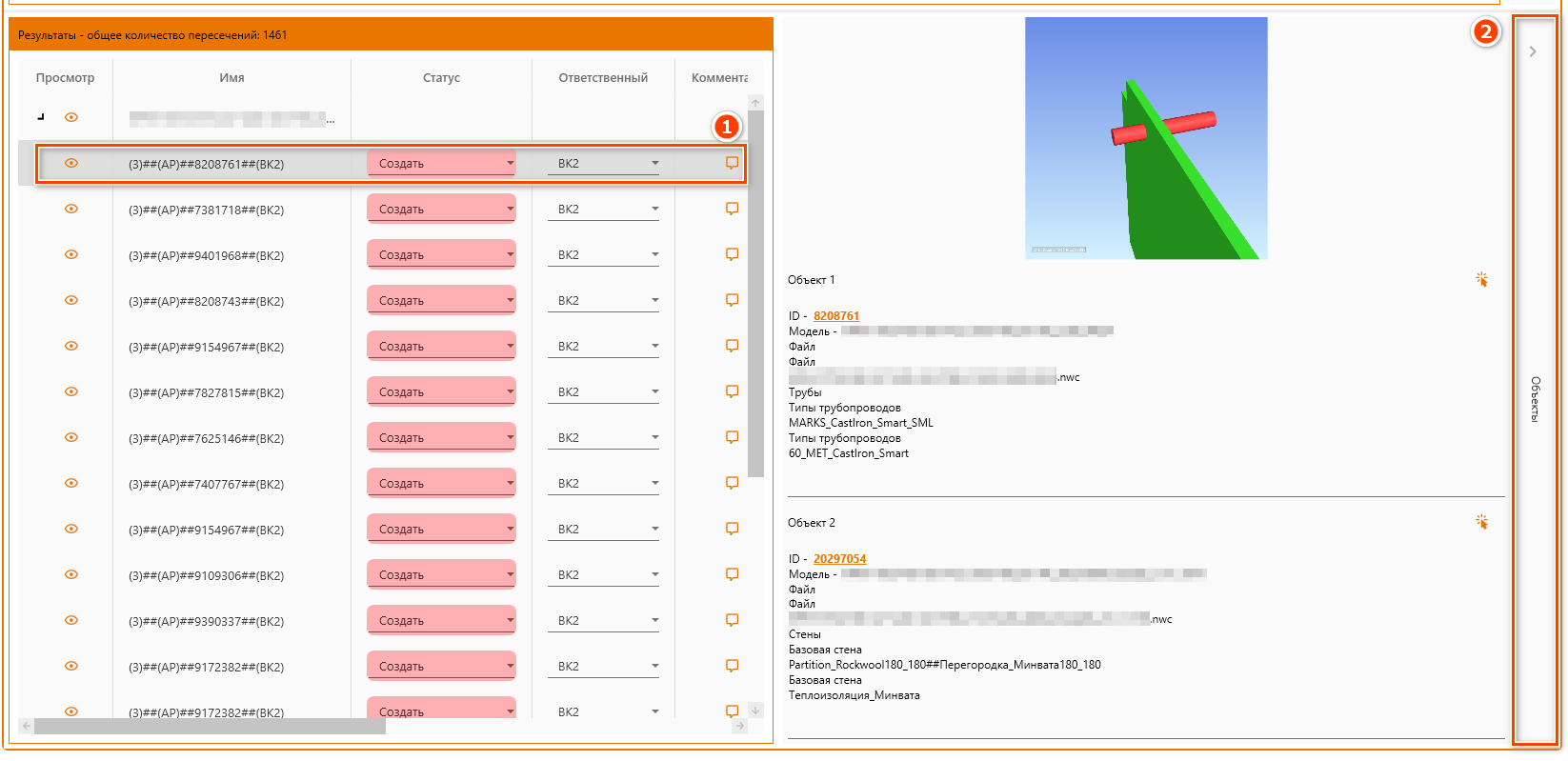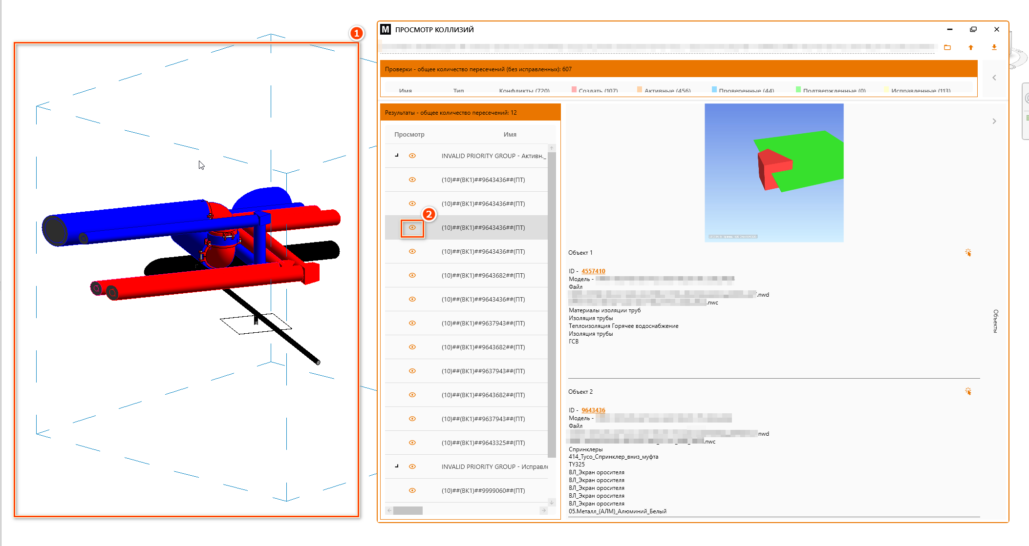 При выборе проверки [1] вы увидите список результатов (коллизий) [2]. Обратите внимание, если результаты сгруппированы, то в списке будут отображаться группы, которые можно раскрыть. Если группирование нет, то будет стандартный список (см. Рисунок 7).