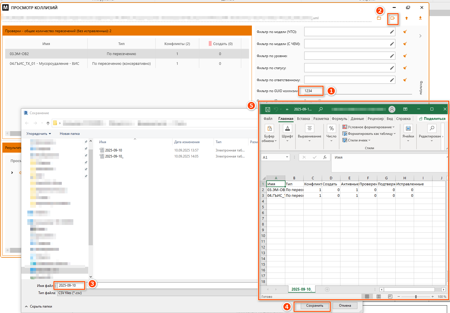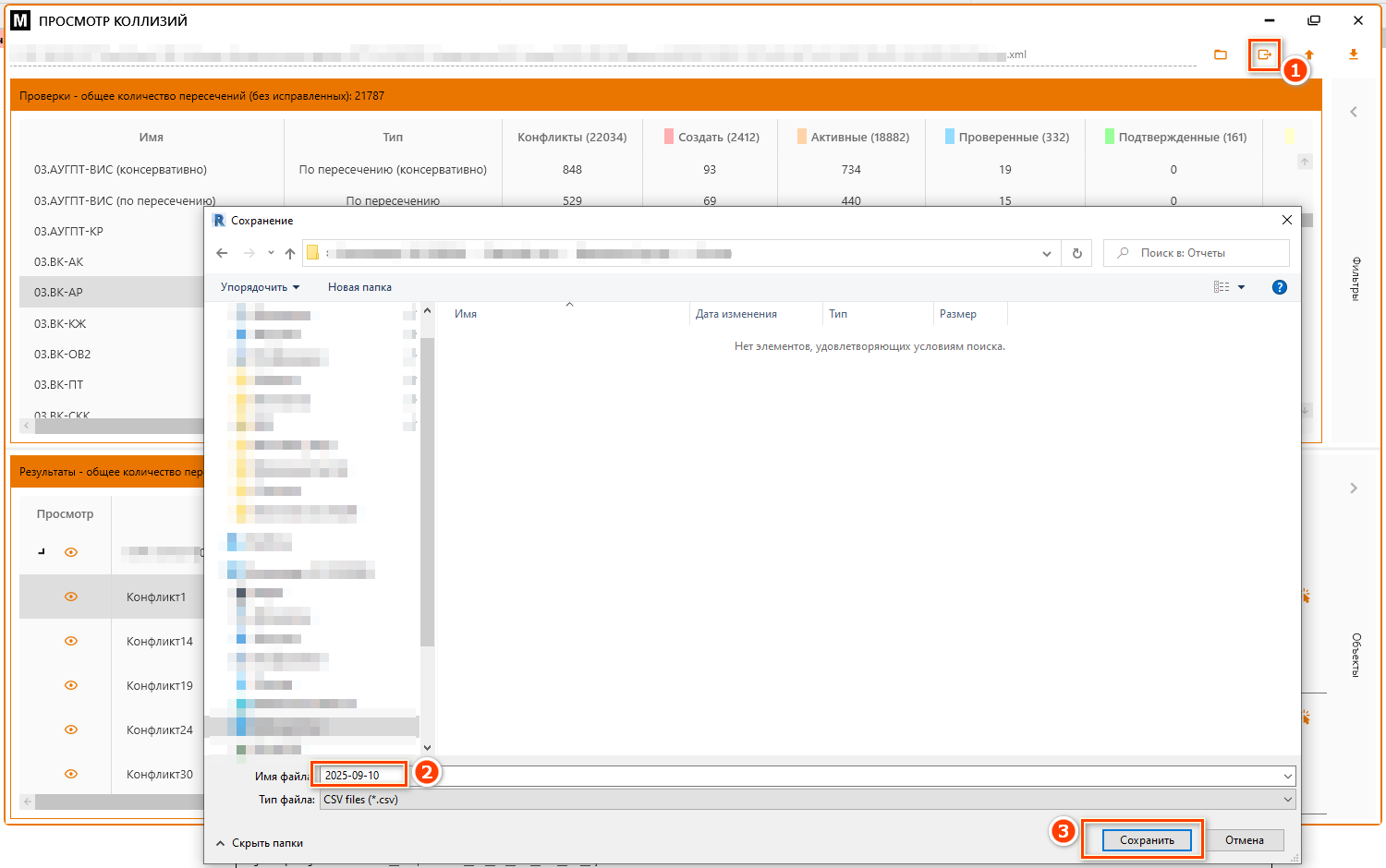 Отчет о коллизиях можно выгрузить в формате таблицы. Для это нужно выбрать кнопку «Экспортировать отчет» [1], ввести наименование файла или оставить стандартное [2], выбрать папку, куда сохранить и нажать «Сохранить» [3] (см. Рисунок 15)
