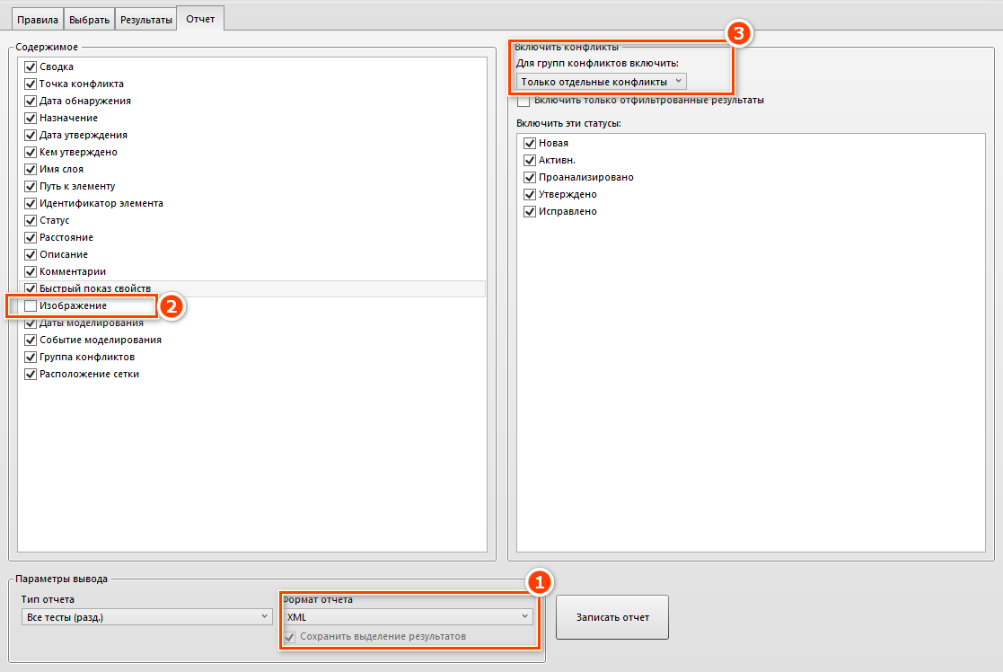 Если у вас присутствует группировка конфликтов в результатах проверок, то в поле Для групп конфликтов включить: «Только отдельные конфликты» [3].