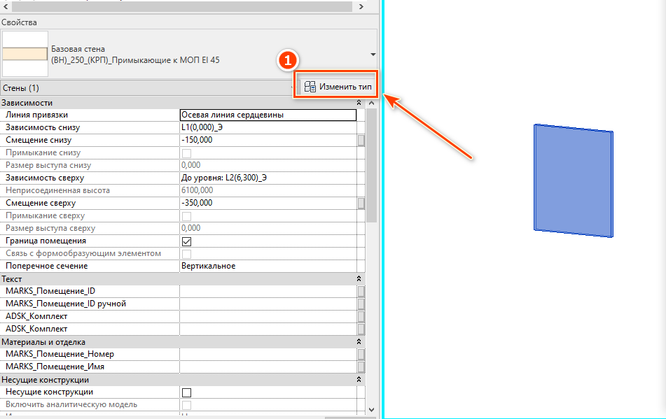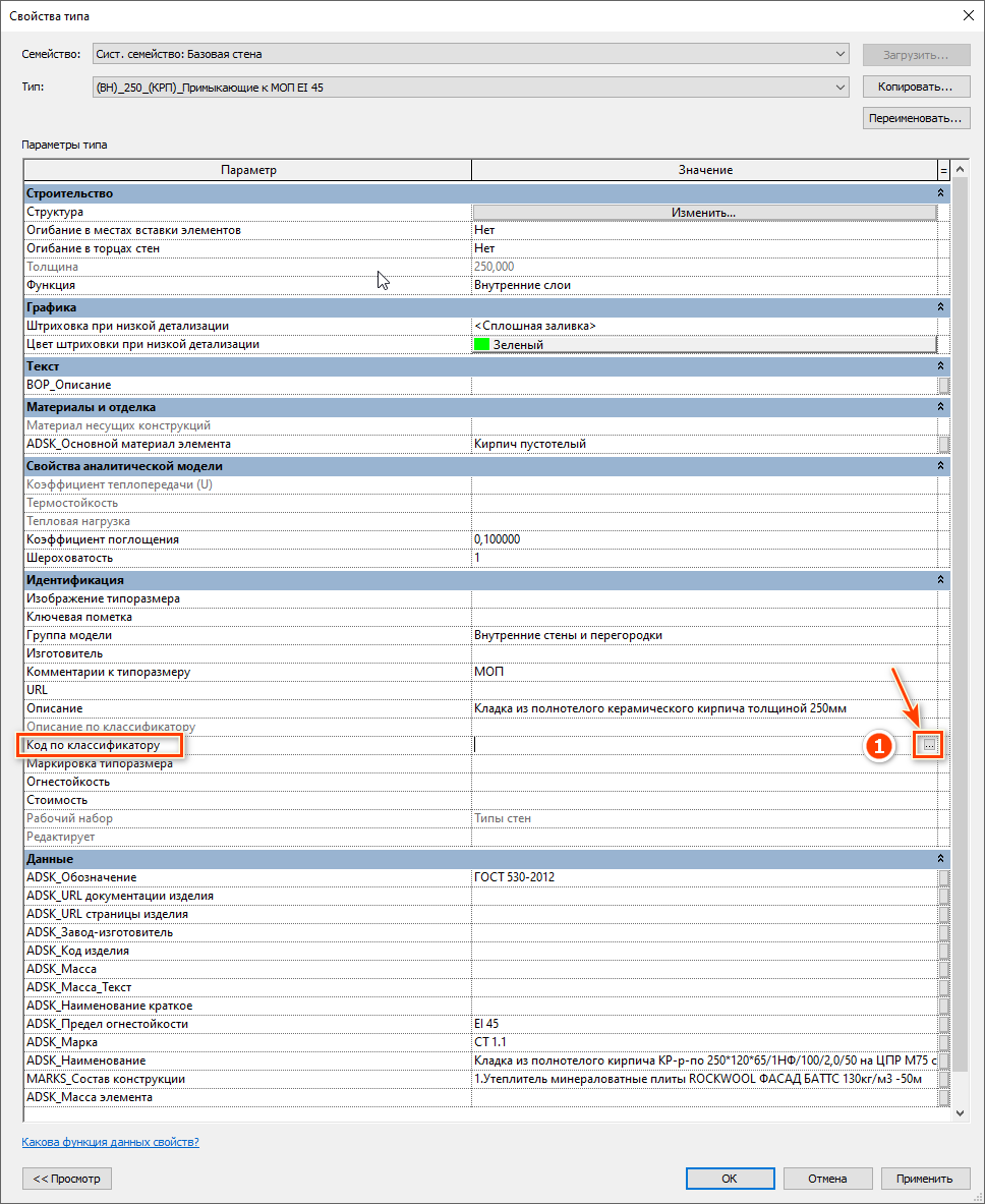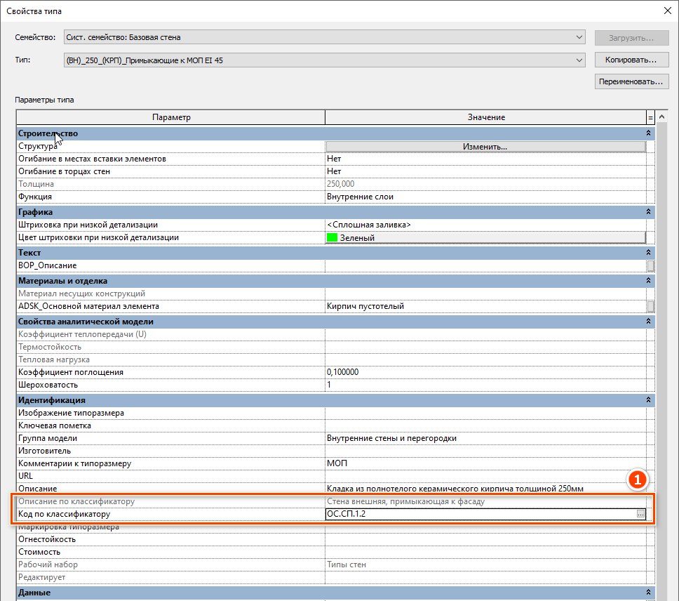Всем элементам модели должен быть назначен код по классификатору. В .txt файле классификатора прописано соответствие элементов и кодов. Для того, чтобы назначить код элементу, зайдите в параметры типа элемента [1] (см. Рисунок 3).