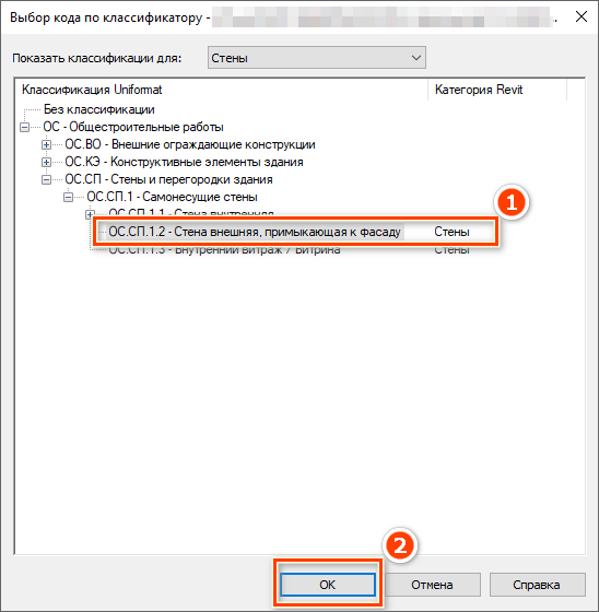 Выберите код, который подходит под описание выбранного элемента и соответствует категории [1], и нажать «ОК» [2] (см. Рисунок 5).