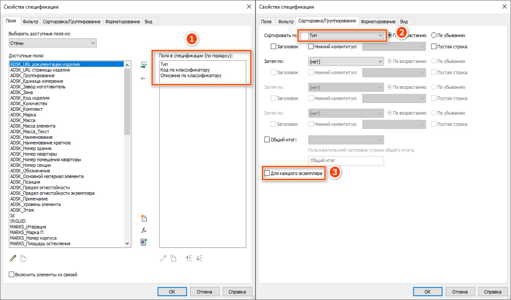 Заполнить код можно через спецификацию. Создайте спецификацию по категории/категориям и назначайте коды через неё. Для этого необходимо добавить параметры «Тип», «Код по классификатору» и «Описание по классификатору» [1]. Сортировать по параметру «Тип» и снять галочку «Для каждого экземпляра» (см. Рисунок 7, Рисунок 8).