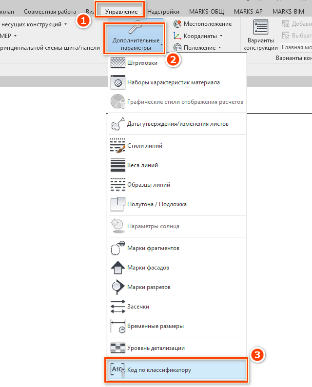 Для того чтобы добавить таблицу классификаторов в проект, перейдите во вкладку «Управление» [1], далее «Дополнительные параметры» [2] и выберите вкладку «Код по классификатору» [3] (см. Рисунок 1).